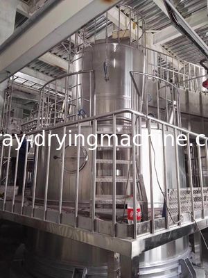 Na het filteren en verwarmen komt de lucht in de luchtverdeler bovenop de droger terecht. De hete lucht komt in spiraalvorm en gelijkmatig in de drukkerij.Door de hoge snelheid centrifuge sprayer op de top van de toren, zal de materiaalvloeistof draaien en worden gespoten in de zeer fijne mistvloeistofkralen. Door de zeer korte tijd van contact met de warmtelucht kunnen de materialen worden gedroogd tot eindproducten .De eindproducten worden continu uit de bodem van de droogtoren en uit de cyclonen afgevoerd.